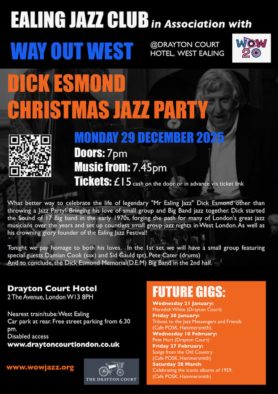The Way Out West gigs continue at our new venue Drayton Court Hotel, West Ealing, usually the third Wednesday (penultimate Wednesday) of the month: